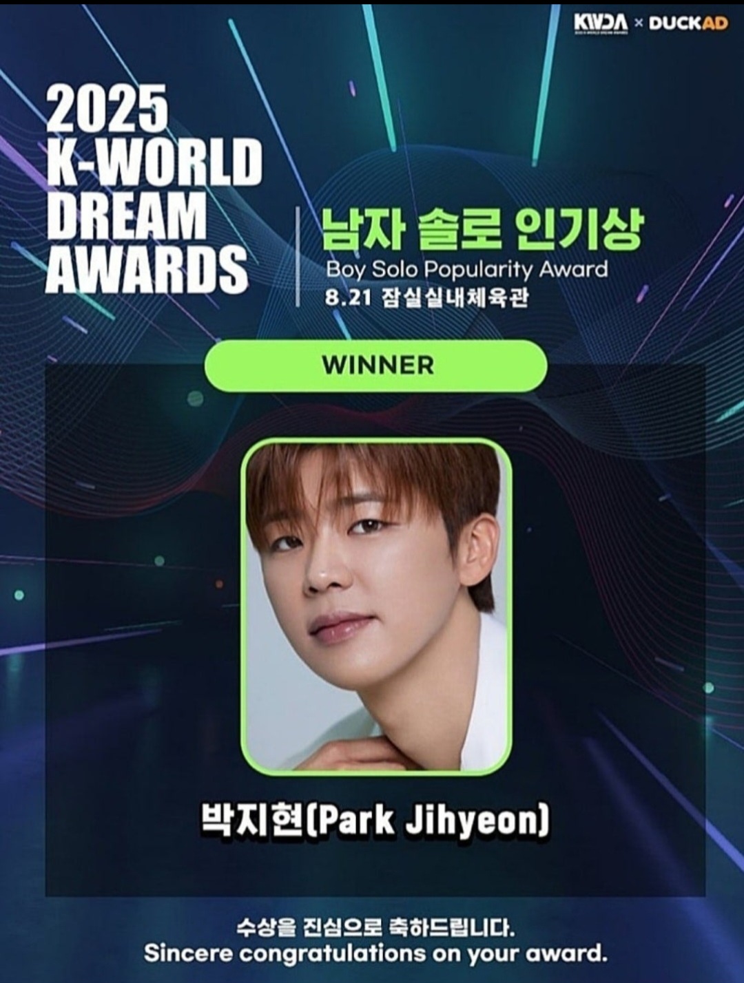 박지현 가수님 2025 KWDA 남자 솔로 인기상 수상을 축하드립니다